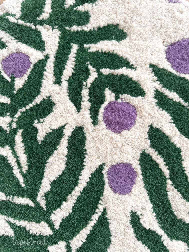 A tufted beauty that brings the outdoors in — this wall hanging features rich green foliage and soft lilac accents, all shaped in a playful curved silhouette. Handmade with care, it blends earthy charm with tactile detail, making it a striking statement for any corner of your space.